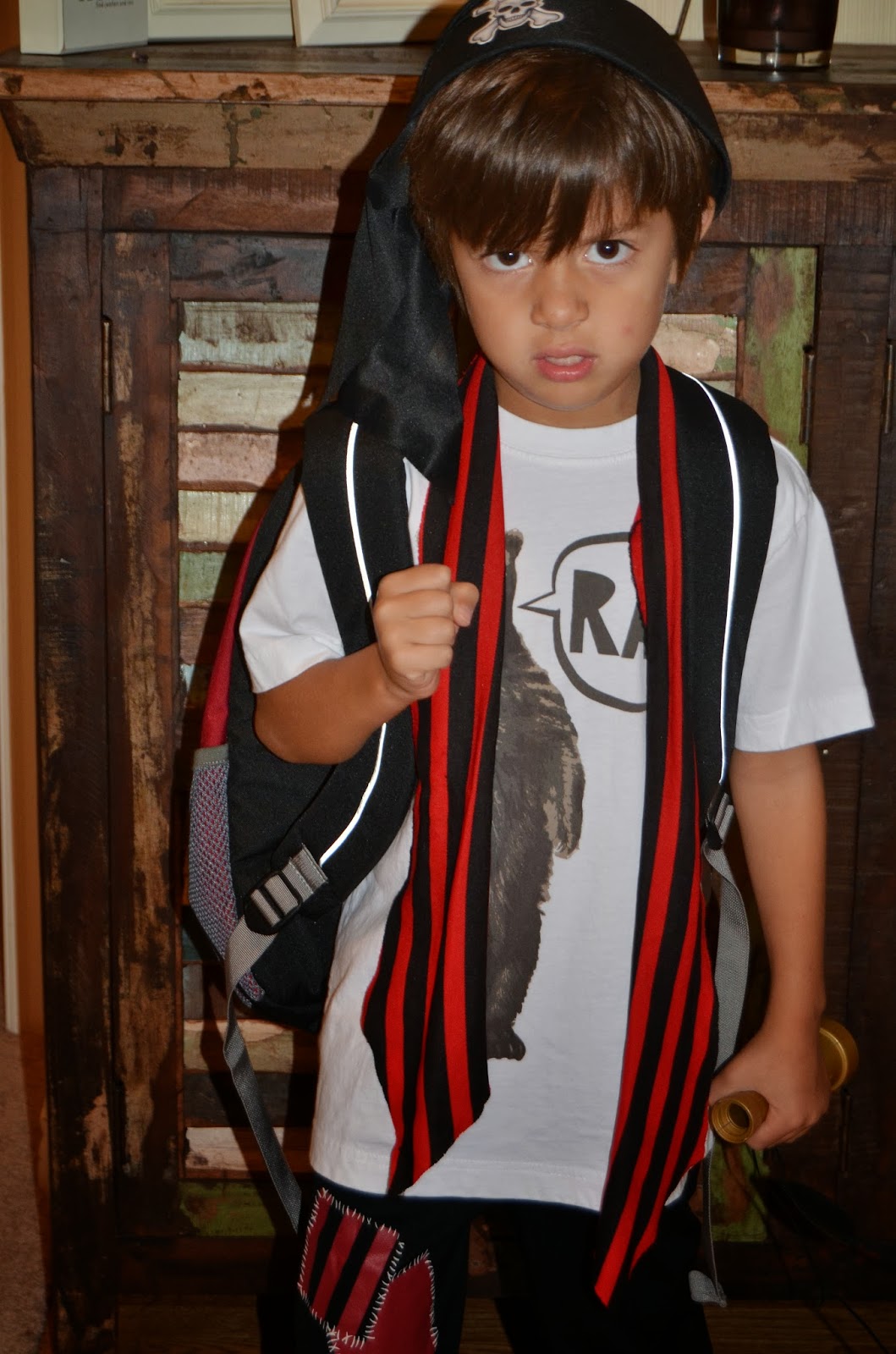 FUN! His school celebrated National "Talk like a pirate" day and they all got to dress up. This is him with his mean "arghh" face.